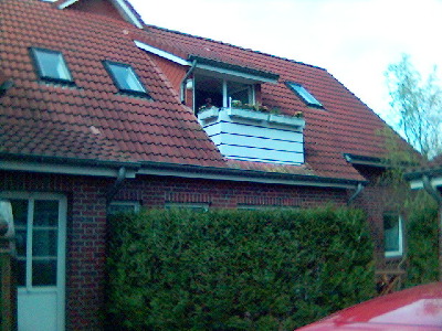 Fangen wir mit Esens an. In dieser kleinen Dachwohnung lebt Katja seit gut drei Jahren. Die leichte Bauweise vermittelt den Eindruck einer Ferienwohnung, was im Sommer sehr schön ist. Doch ist es im Winter recht ungemütlich. Wenn man von Winter sprechen kann. Schnee liegt maximal ein bis zwei Tage. Die meiste Zeit regnet es. Und wenn es nicht regnet, weht einen der Wind weg. Wenn es ganz schlecht läuft, kommt beides zusammen. Glücklicherweise hat die Wohnung einen Balkon. So dass wir im Sommer draußen sitzen können. Die Blumenkästen (gerade frisch bepflanzt) sind unser Gartenersatz.