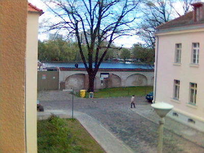 Wenn ich den Kopf beim Herausschauen aus meinem Fenster etwas drehe, habe ich einen schönen Blick auf die Reste der Stadtmauer und auf die Havel, die gleich dahinter fließt. Dort befindet sich auch ein Fischer (weißes Schild), bei dem man frischen und geräucherten Fisch kaufen kann. In der Ferne sieht man die Hochhäuser des Zentrums Ost.