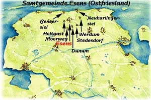 Damit erst gar nicht die Frage aufkommt: Esens? Wo liegt denn das? Hier eine kleine Karte mit allen Gemeinden, die zur Samtgemeinde Esens gehören. Esens ist mit 6000 Einwohnern nicht groß, scheint aber auf Touristen, ähnlich wie Potsdam, eine derartige Anziehungskraft zu besitzen , dass man im Sommer den Stadtkern meiden sollte. Die wenigen Strände an der Nordsee sind eh überfüllt.